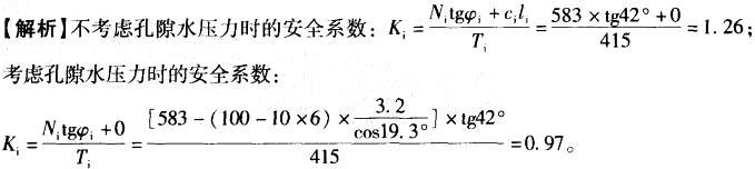 问题 某土石坝坝址区设计烈度为8度,土石坝设计高度30m。计算简图如图6-18所示,采用瑞典圆弧法计算上游坝坡的抗震稳定性,其中第i个滑动条块的宽度b=3.2m,该条块底面中点的切线与水平线夹角θi= 19. 3°,该条块内水位高出底面中点的距离Z=6m,条块底面中点孔隙水压力值u=100KPa,考虑地震作用影响后,第i个滑动条块沿底面的下滑力Si=415kN/m,当不计入孔隙水压力影响时。该土条底面的平均有效法向作用力为583kN/m,根据以上条件按照不考虑和考虑孔隙水压力影响两种工况条件分别计算得出第i个滑动条块的安全系数Ki( = Ri/Si)最接近( )。(土石坝填料凝聚力c=0,内摩擦角φ=42°) A. 1.27; 1.14 B. 1.27; 0.97 C. 1.22; 1.02 D. 1.22; 0.92