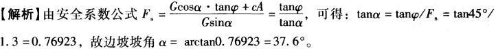 问题 现需设计一个无黏性土的简单边坡。已知边坡高度为10m,土的内摩擦角φ=45°,黏聚力c=0,当边坡坡角α最接近于( )时,其安全系数Fs = 1.3。 A. 45° B. 41.4° C. 37.6° D. 22.8°
