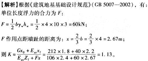 问题 如图6-22所示,一重力式挡土墙底宽b=4.0m, 地基为砂土,如果单位长度墙的自重为G=212kN,对墙址力臂x0=1.8m,作用于墙背主动土压力垂直分量Eaz=40kN,力臂xf=2.2m,水平分量Eax=106kN,(在垂直、水平分量中均已包括水的侧压力)力臂zf=2.4m,墙前水位与基底持平,墙后填土中水位距基底3.0m,假定基底面以下水的压力为三角形分布,墙趾前被动土压力忽略不计,问该墙绕墙趾倾覆的稳定安全系数最接近( )。 A. 1.1 B. 1.2 C.1.5 D. 1.8