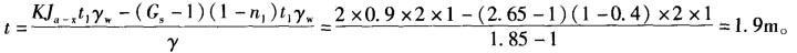 解析 根据《碾压式土石坝设计规范》(SL 274—2001)第8. 2. 4条, ①判别设置排水盖重层的必要性: Ja―x =Δh1/ht = 1.8/2 =0. 9; (Gs-1)(1-n1)/K = (2.65-1)×(1 -0.40)/2 = 0. 495; 得出:Ja-x=0.9>(Gs-1)(1-n1)/K= 0.495; 由于坝基表层土的渗透系数小于下层土的渗透系数,而下游渗透出逸比降又符合上式时应设置排水盖重层或排水减压井,所以应在坝下游设置排水盖重层。 ②排水盖重层的厚度: 故排水盖重层厚度宜为1.9m。