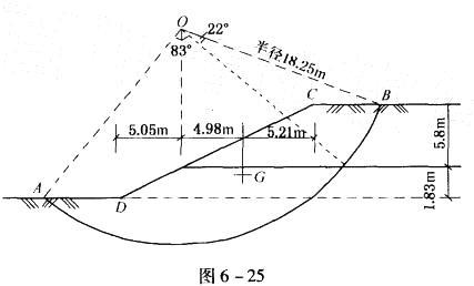 某边坡几何尺寸如图6-25所示。滑坡体的面积为150m2。边坡土层由两层土组成:第一层从坡顶到埋深5. 8m处,其黏聚力c=38.3kPa;以下为第二层,...