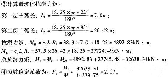 解析 具体计算如下: ①滑坡体的自重(取单位宽度):W= 19. 25×150 =2887. 5kN; ②滑坡体的下滑力矩为:M =G×4.98m=2887. 5×4.98 =14379.75kN·m;