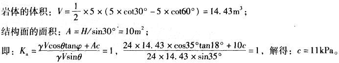 某坡角为60°,坡高为5m的岩质边坡如图6-27所示,结构面倾角,内摩擦角分别为35°、18°,边坡岩体重度为24kN/m3,当边坡处于极限平衡状态时,结...