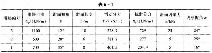已知某折线形滑面边坡的资料(见表6-1),求该边坡滑动稳定性系数为( )。 A. 1.0 B. 1.4 C. 1.8 D. 2. 1