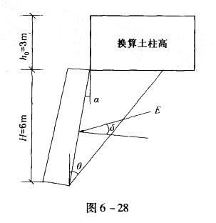 高6m的建筑物路堤挡土墙,如图6-28所示。已知墙背倾角α=9°,墙后填土y= 18kN/m3,φ=40%,δ=20°,填土破裂角θ= 31°08′,填土...