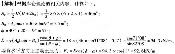 问题 高6m的建筑物路堤挡土墙,如图6-28所示。已知墙背倾角α=9°,墙后填土y= 18kN/m3,φ=40%,δ=20°,填土破裂角θ= 31°08′,填土表面水平且承受均布荷载(换算成土柱高h0=3m),用库仑理论求其墙背水平方向上主动土压力Ea的值为( ) kN/m。 A. 90.5 B. 91.8 C. 92.6 D. 96..4