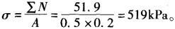 解析 肋柱基底总压力为: ∑N =3Rntan(β-α) +yabH = 3×150×tan( 10°-5°) +25×0.5×0.2×5 =51.9kN; 肋柱基底压应力为: