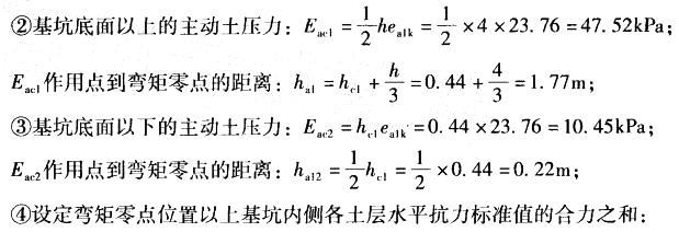 解析 主、被动土压力系数: Ka = tan2 (45°-φ/2) = tan2 (45°-30°/2) =0. 33; Kp = tan2 (45°+φ/2) = tan2 (45°+30°/2) =3; ①基坑底面处的主动土压力:ea1k =4×18×0.33 =23.76kPa; 反弯点(弯矩零点)处的被动土压力:ep1k=yhc1hc1Kp=18×hc1×3 =54hc1; 由 ea1k=ep1k得:hc1=23. 76/54 =0. 44m;