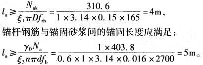 解析 根据《建筑边坡工程技术规范》(GB 50330—2002)第7. 2. 1条、第7. 2. 3条及第7.2.4 条, Nak=Htk/cosa=300/cos15°=310. 6kN; Na=yQ/Nak= 1.3×310. 6=403. 8kN; 锚杆锚固体与地层的锚固长度应满足: