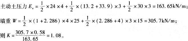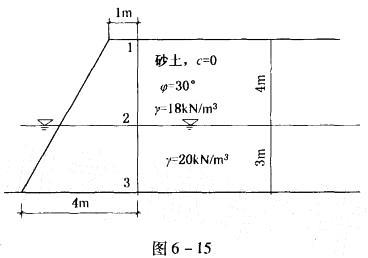 透水地基上的重力式挡土墙,如图6-15所示。墙后砂填土的c=0,φ=30°, y=18kN/m3。墙高7m,上顶宽1m,下底宽4m,混凝土重度为25kN/...