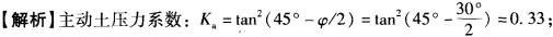 解析 2 点上主动土压力强度 E21 =y1h1Ka =18×4×0.33 =24kPa; 2 点下主动土压力强度E2上 = (10×4)×0.33 = 13.2kPa; 3 点主动土压力强度E2下=24 + 10×3×0.33 =33.9kPa; 3点水压力强度Pw=ywh= 10×3= 30kPa;