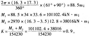 解析 忽略被动土压力产生的抗滑力矩,抗滑力矩是由圆弧面土的剪切力T产生的抗滑力矩和水平支撑产生的抗滑力矩。 对O点取矩,弧长为: