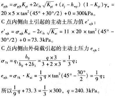 解析 根据《建筑基坑支护技术规程》(JGJ120—1999)第 3.4节、第 3.5 节,C 点埋深11m,小于b0+3b1=3+3×3= 12m,在支护结构外侧荷载影响范围之内,具体分析如下:C点外侧被动土压力epjk :