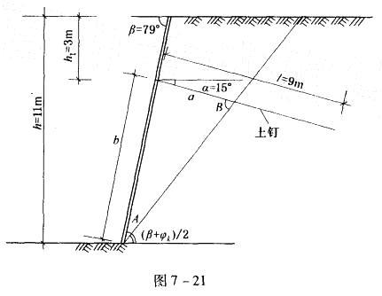 某基坑采用土钉墙支护结构(见图7-21),土钉墙坡度β为79°,土钉墙整体稳定和局部稳定验算均满足规范要求。基坑深度h=11m,为均质土层,土的内摩擦角标...