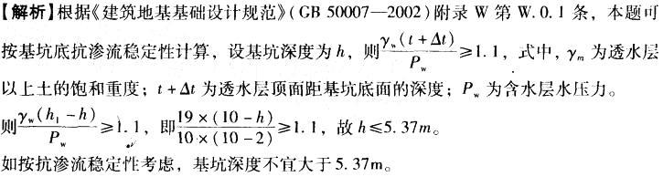 问题 某二级基坑场地中上层土为黏土,其下为粗砂层。黏土厚10m,重度为19kN/m3,粗砂层中承压水水位位于地表下2.0m处。为保证基坑底的抗渗流稳定性,基坑深度不宜大于( )m。 A. 4.9 B. 5.37 C, 5. 73 D. 6.37