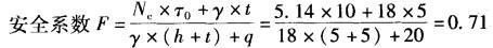 解析 根据《建筑地基基础设计规范》(GB 50007—2002)附录V,进行基坑底抗隆起稳定性验算: 式中,Nc为承载力系数,条形基础时取Nc=5.14;τ0 为抗剪强度(kPa); y为土的重(kN/m3);t为支护结构人员土深度(m);h为基坑开挖深度(m);q为地面荷载(kPa)