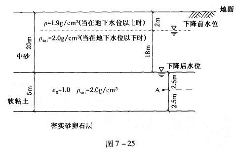 地下水位由距地面2m,下降到距地面20m的软黏土层顶面,从而引起软黏土层的压缩,如图7-25所示。在软黏土层的中点A取土样,试验得到压缩系数a=0.6MP...