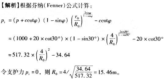 问题 某半径为4.0m的深埋、圆形隧道,围岩水平应力等于垂直应力,应力为p=1000kPa, 围岩内聚力c=20kPa,内摩擦角为30°,根据芬纳(Fenner)公式计算,若使支护力为0,松动半径应为( )m。 A. 48. 1 B. 34.6 C. 15.5 D. 12. 5