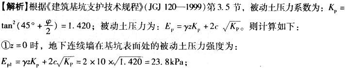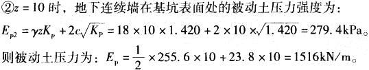 问题 某开挖深度为8m的基坑,采用600mm厚的钢筋混凝土地下连续墙,墙体深度为18m,支撑为一道Φ5500×11的钢管支撑,支撑平面间距为3m,支撑轴线位于地面以下2m。地下水位在地面以下1m,地层为黏性土,天然重度y=18kN/m3,内摩擦角φ=10°, c=10kPa。不考虑地面荷载。若用朗肯土压力理论(水土合算)和静力平衡法进行计算,则: (2)被动土压力为( )kN/m。 A. 1762.0 B. 1516.0 C. 1323.8 D. 279.4