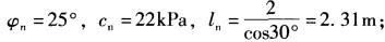 解析 条土的抗滑力为F=Gnntanφn+cnln,则: Gnn=(3×20 +7×10)×2 =260kN; F=260×tan25°×cos30°+22×2.31 =104.9 +50.82 =155.7kN; 抗滑力矩:M=F×30 = 155.7×30 =4672kN·m。