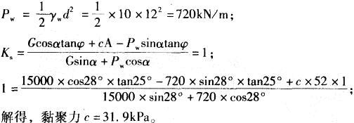 问题 某岩石滑坡代表性剖面如图8-2所示。由于暴雨使其后缘垂直张裂缝瞬间充满水,滑坡处于极限平衡状态,(即滑坡稳定系数Ks=1.0)。经测算滑面长度L=52m,张裂缝深度d=12m,每延长米滑体自重为G=15000kN/m,滑面倾角θ=28°,滑面岩体的内摩擦角φ=25°,试计算滑面岩体的黏聚力最接近( )kPa。(假定滑动面未充水,水的重度可按10kN/m3 计) A. 24 B. 28 C. 32 D. 36