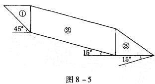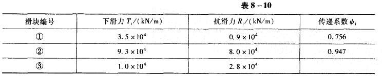某一滑动面为折线型的均质滑坡,某主轴断面和作用力参数如图8-5和表8-10所示,取滑坡推力计算安全系数yt= 1.05,则第③块滑体剩余下滑力F3最接近(...