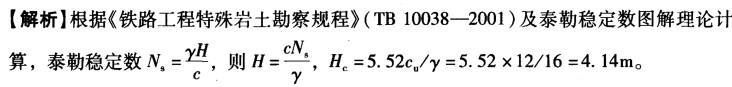 问题 某地段软黏土厚度超过15m,软黏土重度y=16kN/m3,内摩擦角φ=0,内聚力cu=12kPa,假设土堤及地基土为同一均质软土,若采用泰勒稳定数图解法确定土堤临界高度近似解公式,建筑在该软土地基上且加载速率较快的铁路路堤临界高度H最接近 ( )m。 A. 3. 5 B. 4. 1 C. 4. 8 D. 5.6