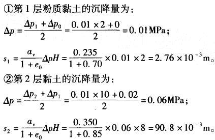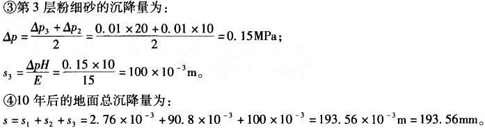解析 黏土层和砂土层沉降量的计算公式分别为: 式中,s黏、s砂分别为黏土层和砂土层的最终沉降量(m);av为土层的压缩或回弹系数(MPa-1);Δp如为由于地下水位变化而施加于土层上的平均压力(MPa);H为计算土层的厚度(m);e0为土层原始孔隙比;E为砂土层的弹性模量(MPa)。地下水位每下降1m 所对应的水压力为1×103×10×1=104Pa=0.0.1MPa。用分层总和法进行计算,具体步骤如下: