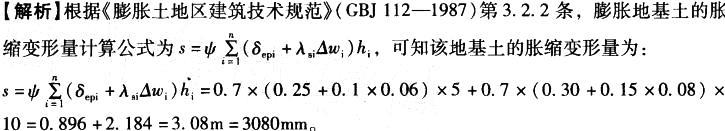 问题 某膨胀土地基分为两层,已知第一层:h1=5m,εep1=25%,λs1=10%, Δw1=0.06;第二层:h2=10m,δep2=30%,λs2=15%,Δw2 =0.08;根据《膨胀土地区建筑技术规范》(GBJ 112-1987)中规定的计算公式: (1)取胀缩变形量的经验系数ψ=0.7,则该地基土的胀缩变形量为()mm。 A. 105 B. 2870 C. 2975 D. 3080
