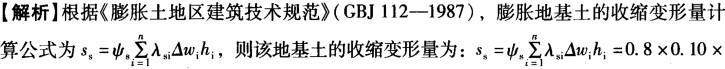 问题 某膨胀土地基分为两层,已知第一层:h1=5m,εep1=25%,λs1=10%, Δw1=0.06;第二层:h2=10m,δep2=30%,λs2=15%,Δw2 =0.08;根据《膨胀土地区建筑技术规范》(GBJ 112-1987)中规定的计算公式: (3)取收缩变形量的经验系数ψs=0.8,则该地基土的收缩变形量为( )mm。 A. 60 B. 90 C. 120 D. 3520