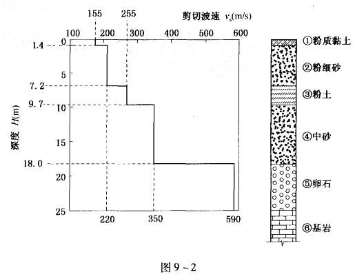 问题 图9-2所示为某工程场地钻孔剪切波速测试的结果,据此计算确定场地土层的等效剪切波速和该场地的类别。试问下列哪个选项的组合是正确的?( ) A. 173m/s,I 类 B. 261m/s, II 类 C. 192m/s,III类 D. 290m/s,IV类