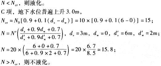 解析 根据《水利水电工程地质勘察规范》(GB 50487—2008)附录P第P.0.4条,填方和水位下降均值砂土液化可能性减小,可排除AD两项。B项,场地普遍挖方3.0m,标准贯入锤击数临界值: