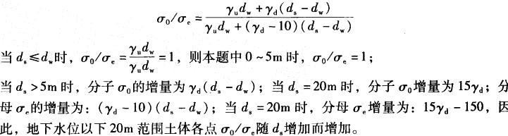 问题 拟在8度烈度场地建一桥墩,基础埋深2.0m,场地覆盖土层为20m,地质年代均为Q4,地表下为5.0m的新近沉积非液化黏性土层,其下为15m的松散粉砂,地下水埋深dw=5.0m,按《公路工程抗震设计规范》(JTJ 004—1989)列式说明本场地地表下20m范围土体各点σ0/σe,下述( )是正确的。 A.从地面往下二者之比随深度的增加而不断增加 B.从地面往下二者之比随深度的增加而不断减少 C.从地面5m以下二者之比随深度增加而不断增加 D.从地面5m以下二者之比随深度增加而不断减少
