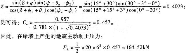 问题 某水闸下游岸墙(见图9-4)高6m,墙背倾斜与垂线夹角ψ1=15°,墙后填料为粗砂,填土表面水平,粗砂内摩擦角φ=30°,墙背与粗砂间摩擦角δ= 15°。岸墙所在地区地震烈度为8度,则在水平地震力作用下(不计竖向地震力作用)在岸墙上产生的地震主动动土压力FE(地震系数角θe取3°,土的重度为20kN/m3)最接近( )kN。 A. 100.5 B. 120.4 C. 150.6 D. 164.5