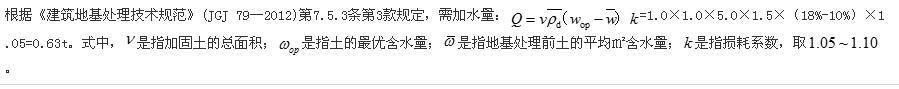 问题 对于某新近堆积的自重湿陷性黄土地基,拟采用灰土挤密桩对柱下独立基础的地基进行加固,已知基础为1.0m×1.0m的方形,改层黄土平均含水量为10%,最优含水量为18%,平均干密度为1.50t/m3。根据《建筑地基处理技术规范》(JGJ 79—2012),为达到最好加固效果,拟对该基础5.0m深度范围内的黄土进行增湿,试问最少加水量取下列何项数值合适?