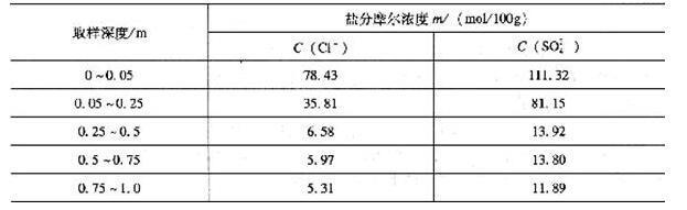 在一盐渍土地段,地表1.0m深度内分层取样,化验含盐成分如表1所示。按《岩土工程勘察规范》(GB 50021—2001)计算该深度范围内取样厚度加权平均盐...