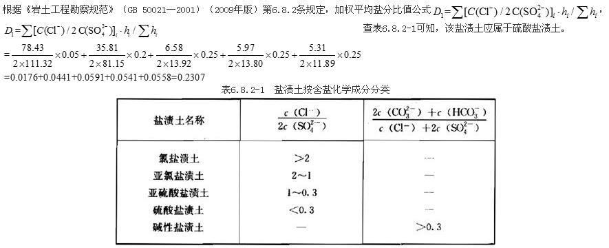 问题 在一盐渍土地段,地表1.0m深度内分层取样,化验含盐成分如表1所示。按《岩土工程勘察规范》(GB 50021—2001)计算该深度范围内取样厚度加权平均盐分比值D1=[C(Cl-)/2C(SO2-4)]并判定该盐渍土应属于(  )盐渍土。 表1 含盐成分表