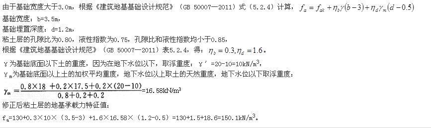 问题 某矩形基础,长×宽为4m×3.5m,埋深1.2m,地下水位1.0m,地面以下0~0.8m为人工填土,天然重度为18kN/m3,0.8m以下为粘土层,孔隙比为0.80,液性指数为0.75,地下水位以上粘土层的天然重度为17.5kN/m3,地下水位以下粘土层的饱和重度为20kN/m3,已知从载荷试验确定的粘土层的地基承载力特征值fak=130kPa。修正后的粘土层地基承载力特征值fa为(  )kPa。
