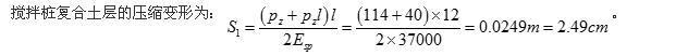 某水泥搅拌桩复合地基桩长12m,面积置换率m=0.21,复合土层顶面的附加压力Pz=114kPa,底面附加压力Pzl=40kPa,桩间土的压缩模量Es=2...