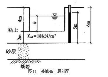 问题 某地基土层剖面如图11所示,砂层为承压水层,根据测压管中水位可知,承压水头高出砂层顶面5m。现在粘土层中开挖基坑深4m,要求确定防止基坑底板发生流土的水深h至少应为(  )m。