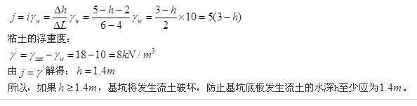 解析 根据发生流土的临界条件,当渗透力j=γ'时,土层发生流土破坏。 粘土层渗透力: