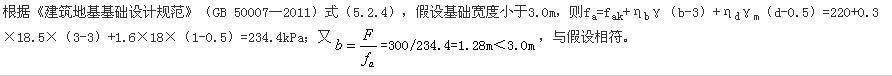 问题 某住宅采用墙下条形基础,建于粉质黏土地基上,未见地下水,由荷载试验确定的承载力特征值为220kPa,基础埋深d=1.0m,基础底面以上土的平均重度γm=18kN/m3,天然孔隙比e=0.70,液性指数,IL=0.80,基础底面以下土的平均重度γ=18.5kN/m3,基底荷载标准值为F=300kN/m,修正后的地基承载力最接近(  )kPa。(承载力修正系数ηb=0.3,ηd=1.6)