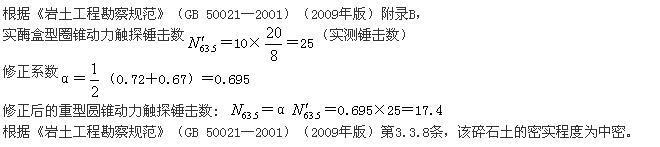 问题 某场地中自8.0m以下为碎石土,钻探中在10.0m处进行重型动力触探,地面以上钻杆长度为1.0m,锤击数20击时的贯入深度为8cm,根据《岩土工程勘察规范》(GB 50021—2001),该碎石土的密度程度为(  )。
