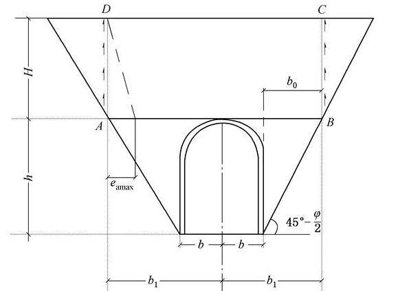 问题 浅埋洞室半跨b=3.0m,高h=8m。如图8所示。上覆松散体厚度H=20m,容重=r18kN/m3。黏聚力c=0,内摩擦角φ=20°。用太沙基理论求AB面上的均布压力最接近于(  )kN/m2。
