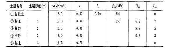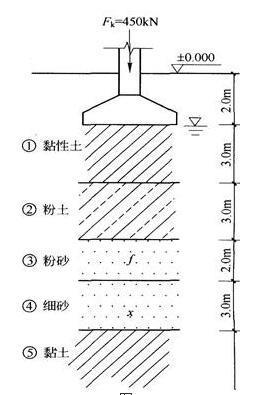 某一建筑物按抗震要求为乙类建筑,条形基础宽度b=2.0m,埋深d=2.0m,地基剖面如图5所示,基础底面下各层土的厚度、土性指标等如表2所示,荷载按地震效...