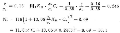 解析 解法一 根据剪应力比与临界标准贯入锤击数的关系式可求得临界标准贯入锤击数Nc 解得Nc=16.1 σ0=18×2+20×(8-2)=156 Cn=0.842 N1=Cn·N63.5=0.842×18=15.2 N1<Nc,砂土液化。 解法二 N1<Nc,砂土液化。