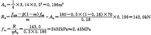 采用水泥土搅拌桩加固地基,桩径取d=0.50m,等边三角形布置,复合地基置换率m=0.18,桩间土承载力特征值fsk=70kPa,桩间土承载力折减系数β=...