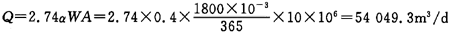 问题 一铁路隧道通过岩溶化极强的灰岩,由地下水补给的河泉流量Q′为50×104m3/ d,相应于Q′的地表流域面积F为100km2,隧道通过含水体的地下集水面积A为 10km2,年降水量W为1800mm,降水入渗系数a为0.4。按《铁路工程地质手册》(1999年版),用降水入渗法估算,并用地下径流模数(M)法核对,隧道通过含水体地段的经常涌水量Q最接近( )。