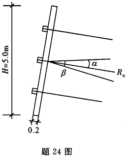 如图一锚杆挡土墙肋柱高H为5.0m,宽α为0.5m,厚b为0.2m,打三层锚杆,其锚杆支点处反力Rn均为150kN,锚杆对水平方向的倾角β均为10°,肋柱...