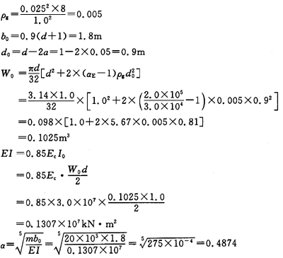 问题 某灌注桩,桩径1.0m,桩身配筋8φ25,混凝土强度等级C30,保护层厚度为 50mm,桩周3.2m范围内地基土为粉质黏土,其水平抗力系数的比例系数m=20MN/m4(f1=1.43N/mm2,Ec=3.0×104N/mm2,Es=2.0×105N/mm2),桩长13m,桩顶标高 2.0m,桩顶作用竖向压力,设计值N=1500kN。则桩的水平变形系数。为( )m-1。